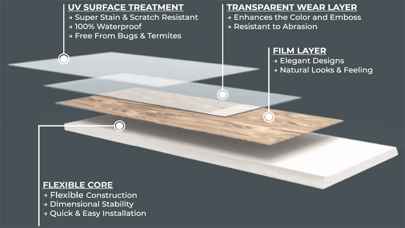 Our Engineered Flexible SPC flooring, which stands for Stone Plastic Composite, is the latest innovative material in the flooring world. It is a premium type of replacement to traditional LVT.